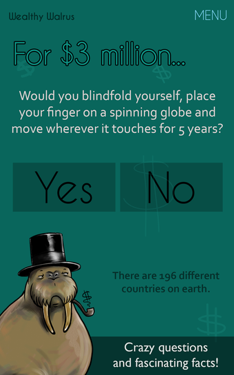 الفيل الثري هو تطبيق مجاني لنظام التشغيل أندرويد تم تطويره بواسطة لامافيش في فئة أسلوب الحياة. إنه تطبيق يختبر حدودك من خلال تقديم مبالغ ضخمة من المال مقابل القيام بأشياء مجنونة تتجنبها عادةً بأي ثمن. البرنامج هو لعبة تسألك أسئلة مجنونة تطلب منك ما الأشياء السخيفة التي ستفعلها من أجل ملايين الدولارات.